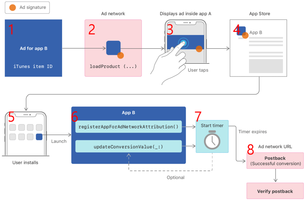 - 스탭 6이 이루어 지고 나면 앱 B에서는 최소 25시간 지속되는 타이머가 시작됩니다. (이 타이머는 연장될 수 있습니다. 타이머에 대한 상세 설명은 아래에서.) 앱 B는 이 기간동안 Post-install Event가 발생하길 기다립니다. Post-install Event가 발생하면 ‘updateConversionValue(_:)’라는 기능을 실행하고 Post-install Event를 기록합니다.